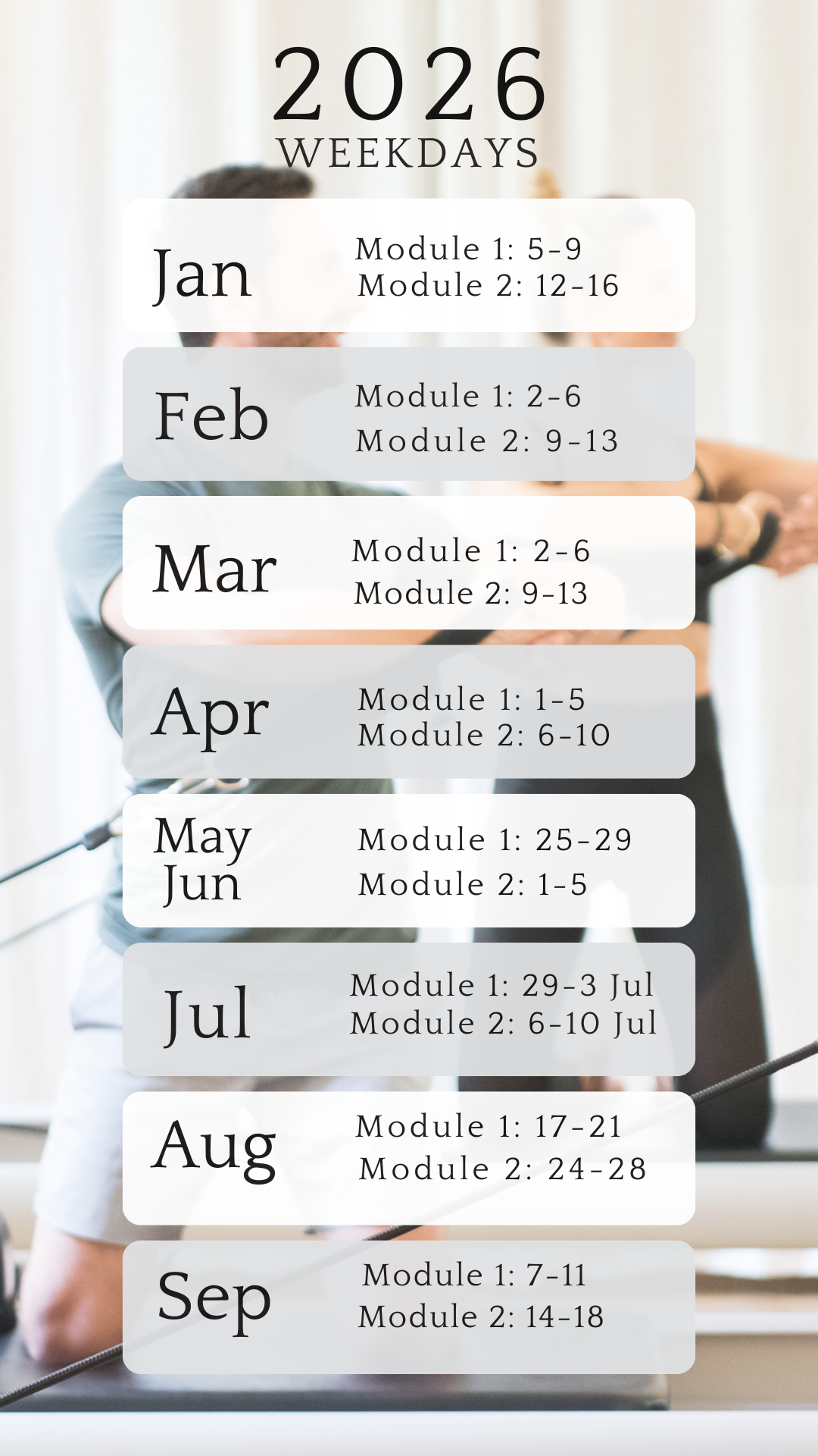 - Experienced Pilates practitioners seeking deeper apparatus knowledge.