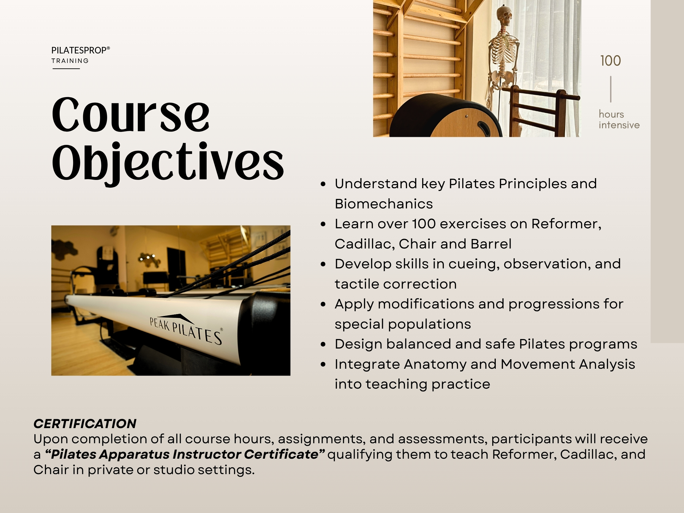 • Full apparatus repertoire: Mat · Reformer · Cadillac · Chair · Barrel