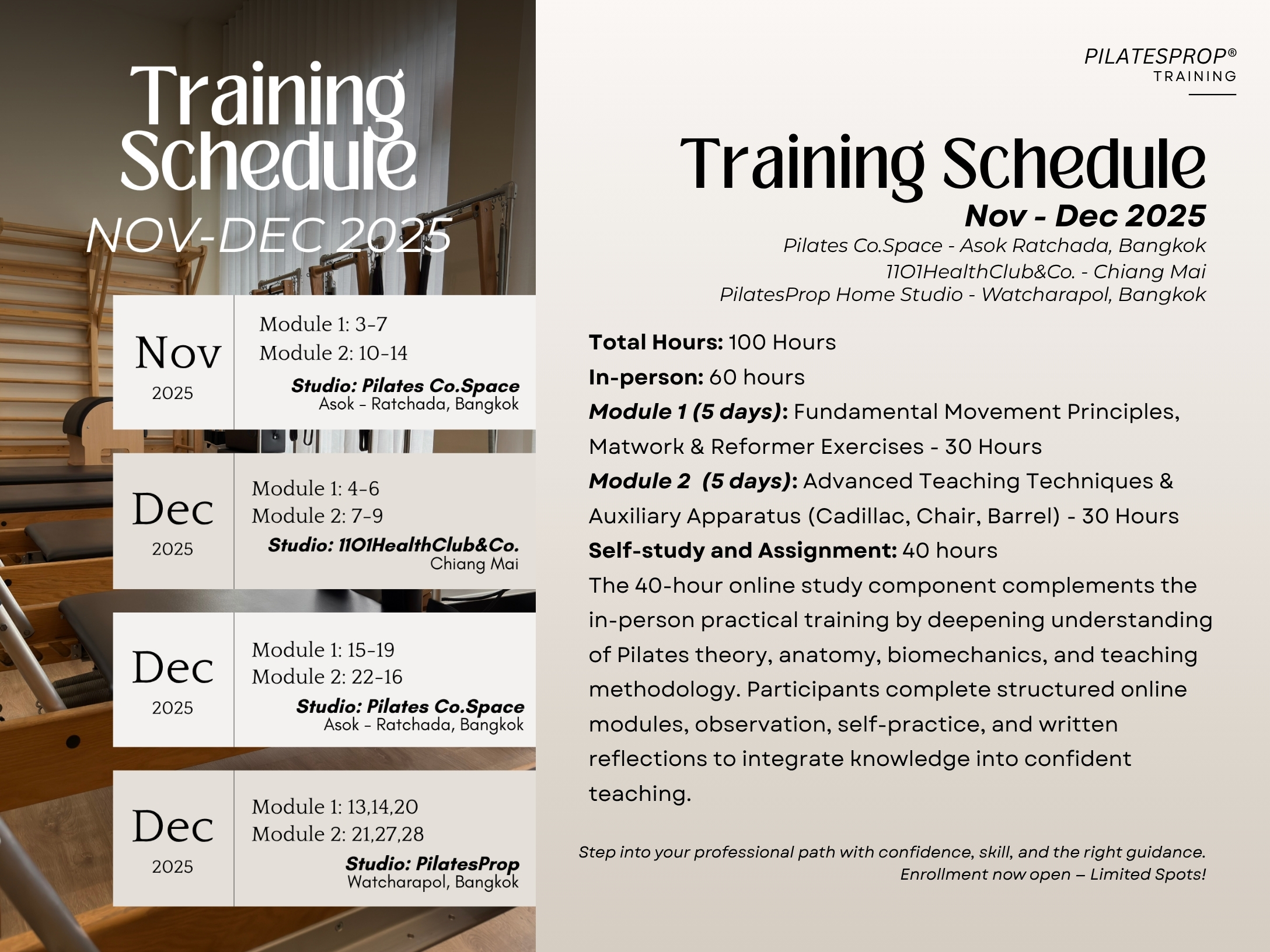 State-of-the-Art Training Studio: Equipped with Peak Pilates apparatus imported from the USA for an authentic learning experience.